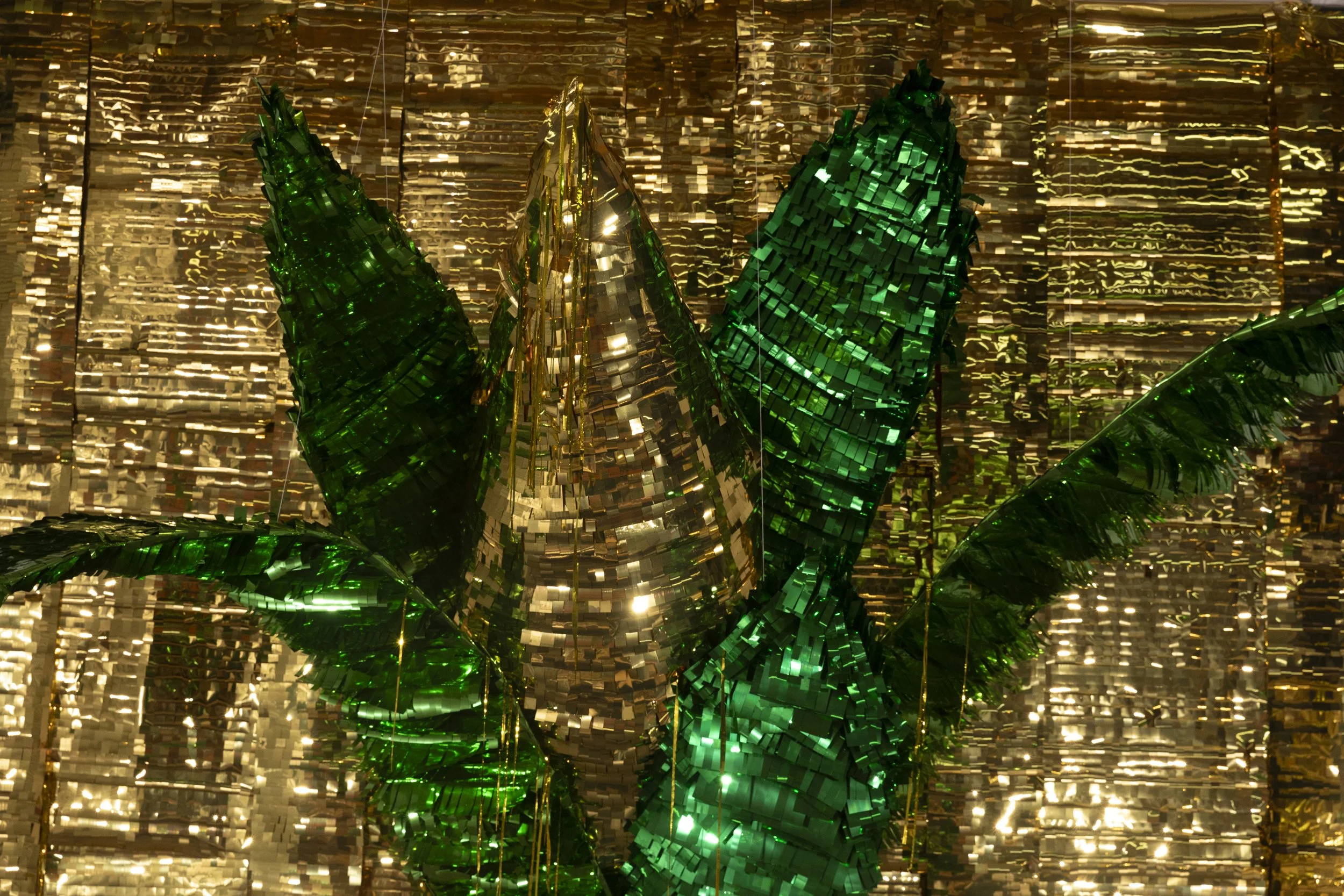 Capilla de Maíz, a site-specific installation by Justin Favela, transforms the Rubenstein Grand Salon at SAAM’s Renwick Gallery into a fantastical world, with shimmering gold-fringed walls and piñata corncobs that highlight the role of maize in North American visual culture. In Capilla de Maíz, Favela draws together many sources and symbols of maize, frequently called “yellow gold” in the Americas. Maize sustained Indigenous peoples and later European settlers, helping to grow the American agricultural economy. The shimmering gold-fringed walls combine two Mexican art practices, cartonería and the lavish Churrigueresque ornamentation of eighteenth-century Mexican Catholic churches.