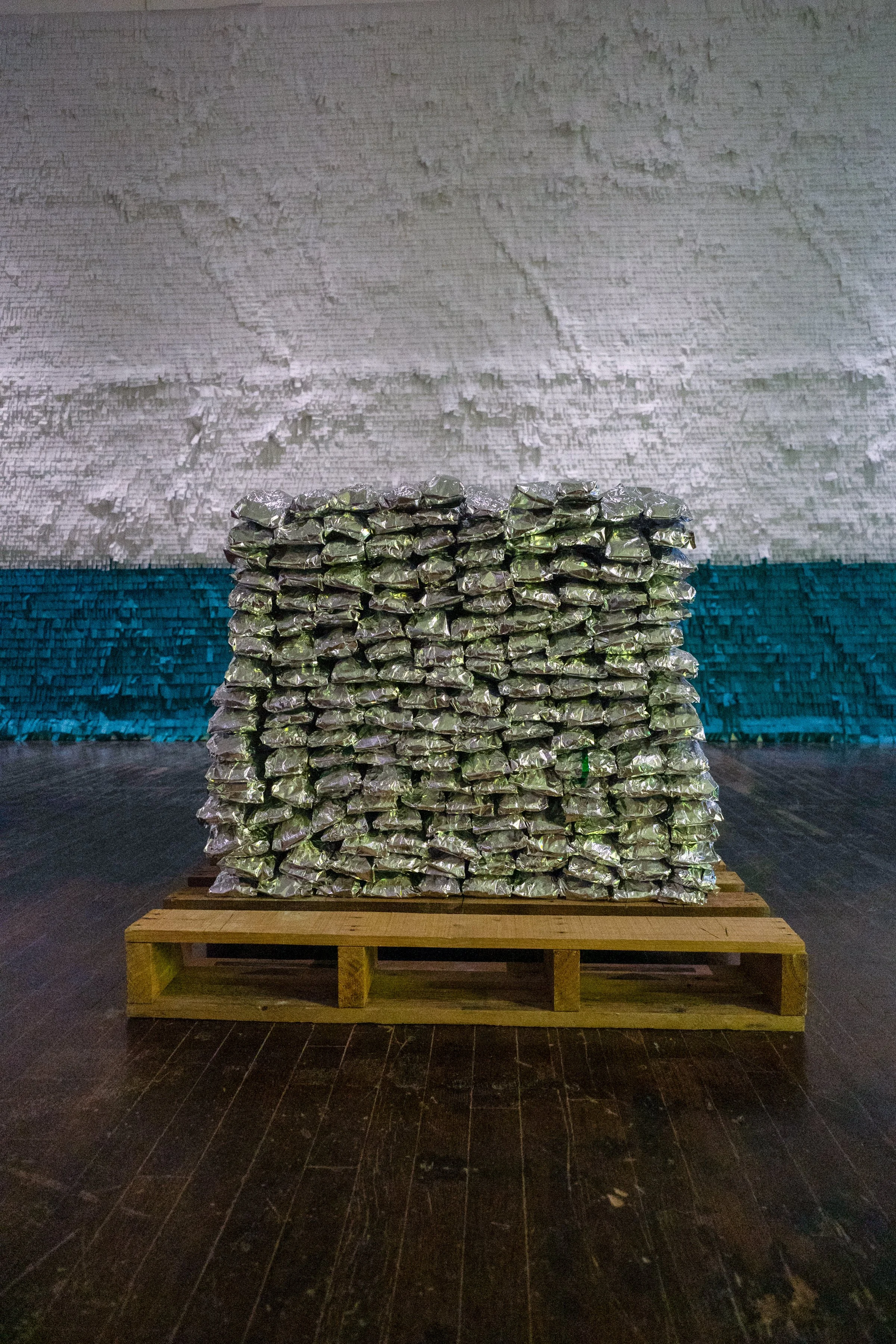 Found objects, paper and cement wrapped in green polyester film and aluminum foil, 2010-2025